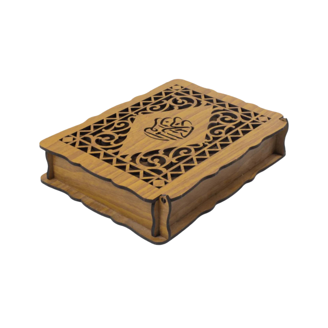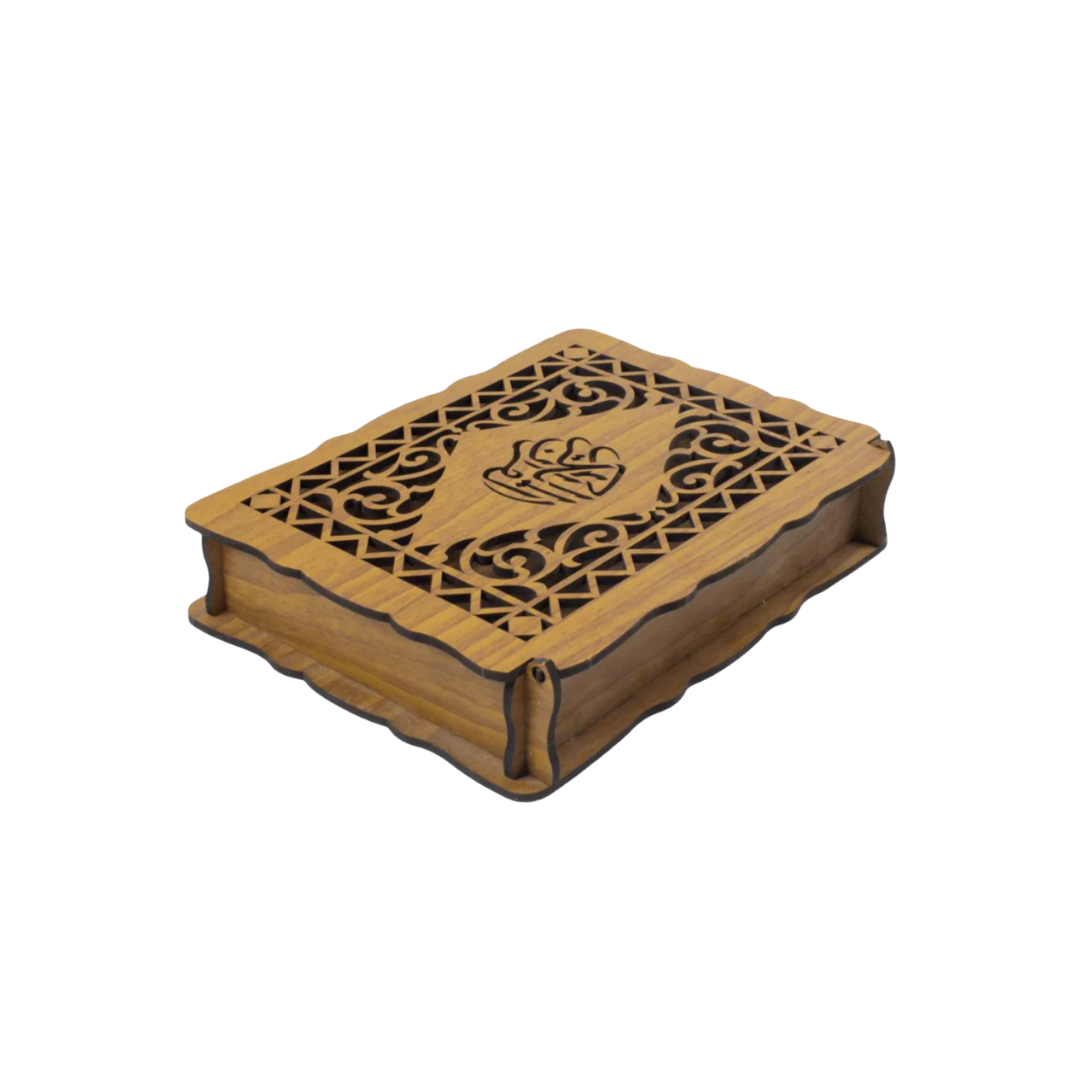 Découvrez le Coffret en Bois pour Coran, une pièce d'artisanat conçue pour allier protection sacrée et esthétique traditionnelle. Fabriqué à partir de bois de qualité avec une finition naturelle, ce coffret se distingue par son couvercle finement travaillé. Les découpes au laser créent des motifs géométriques élégants qui entourent une calligraphie centrale raffinée.