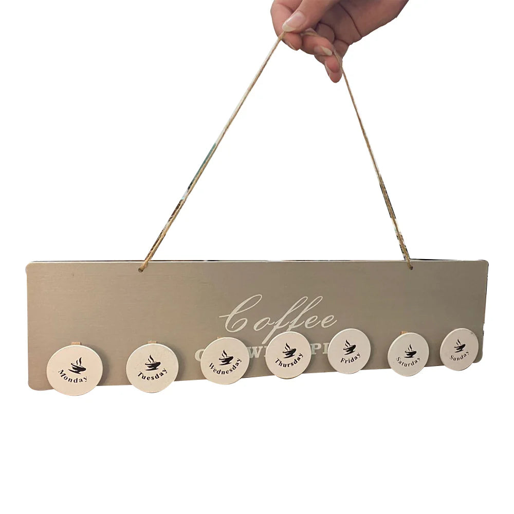 Transformez votre espace café avec cette plaque décorative murale Coffee, un accessoire à la fois esthétique et pratique. Conçue en bois avec une finition naturelle, elle affiche les jours de la semaine accompagnés de pastilles décoratives au thème café, idéales pour apporter une ambiance chaleureuse et conviviale à votre cuisine, coin café ou espace détente.