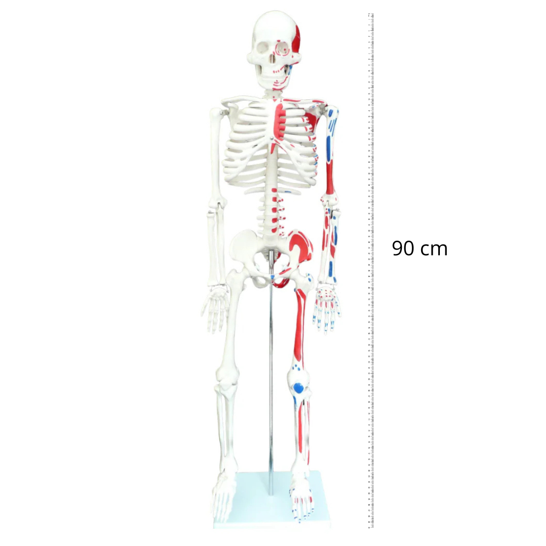 Ce modèle anatomique détaille un squelette humain complet, enrichi par les insertions et origines musculaires, idéal pour l’étude, l’enseignement, les démonstrations ou l’usage professionnel en santé ou biologie.