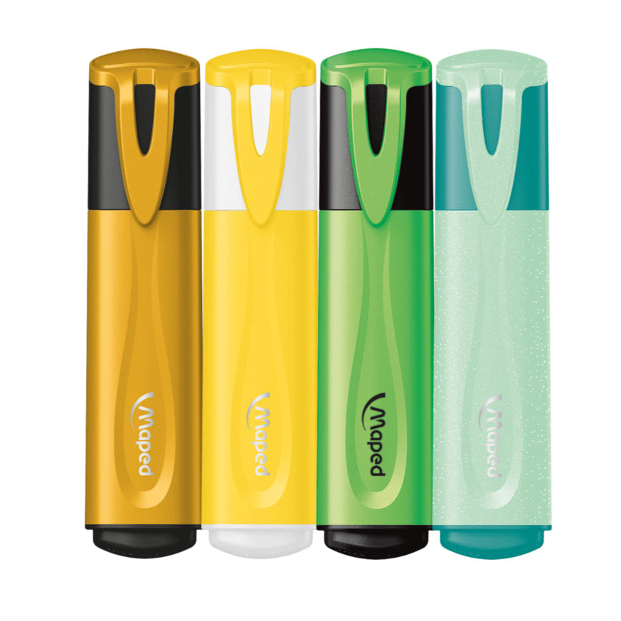 Surligneurs fluorescents, pailletés ou pastels, retrouvez des surligneurs dans tous les styles et nuances de jaune-vert pour mettre en valeur vos écrits et documents. Dotés d'une pointe souple et extra-douce, les surligneurs Fluo'Peps de Maped sont agréables à utiliser. Surlignez avec précision grâce à la pointe biseautée des surligneurs, qui permet de réaliser des traits fins ou épais, de 1 à 5 mm. , , C'est l'outil idéal pour décorer des cahiers et des feuilles de révision, des bullet journals et des listes de tâches. Les couleurs sont vives et brillantes. Les surligneurs Fluo'Peps sont de haute qualité et efficaces dans le temps. , , Leurs capuchons tiennent fermement sur le stylo afin qu'ils ne s'ouvrent pas d'eux-mêmes. Ils ne sèchent pas même si le bouchon n'est pas remis immédiatement (jusqu'à 4 heures).