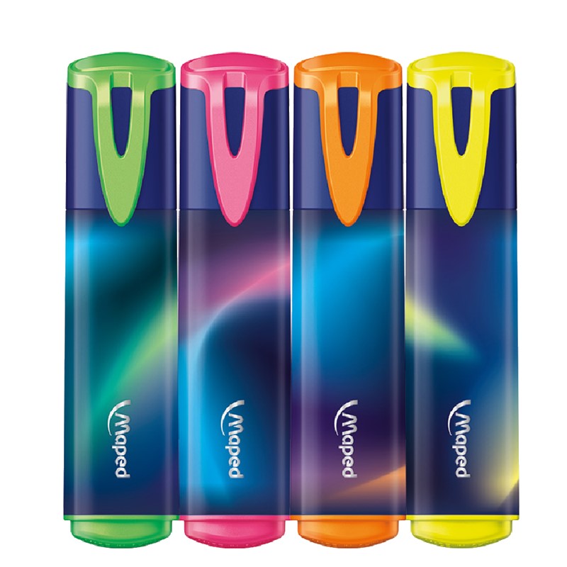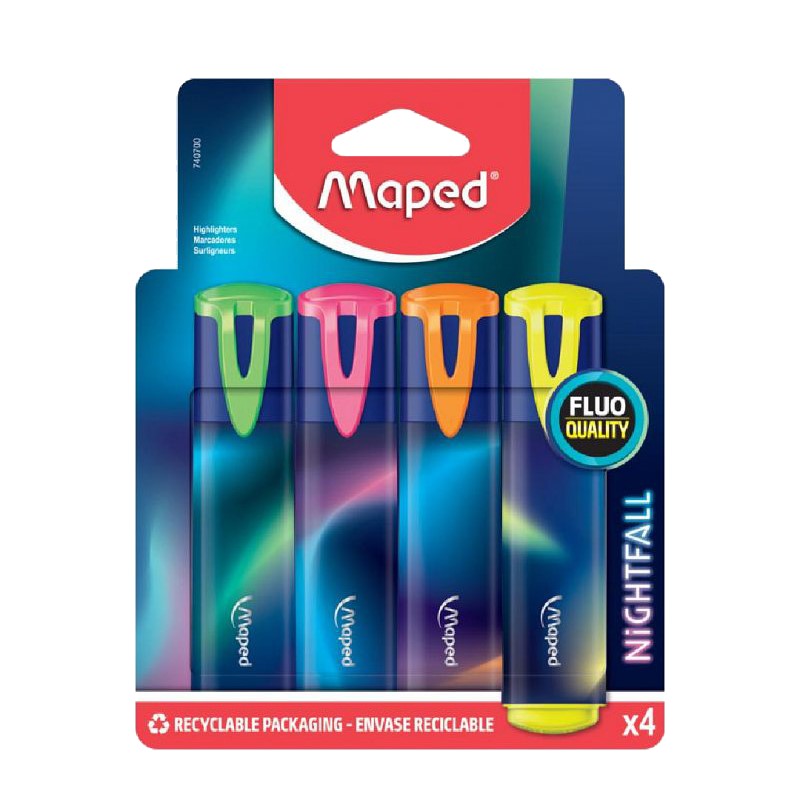 Pochette de 4 surligneurs MAPED Nightfall - L'épaisseur du trait varie entre 1 et 5 mm selon le positionnement du surligneur - Pointe biseautée assure un surlignage facile et fluide - Décoré est super tendance ! - une encre de qualité, lumineuse et fluo, sans traverser ou déchirer le papier- Pochette en carton recyclable - Couleur: Assortis