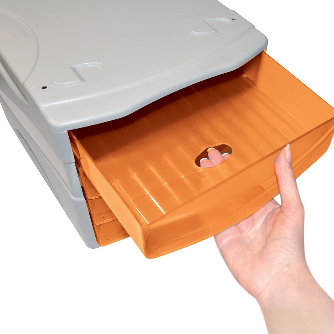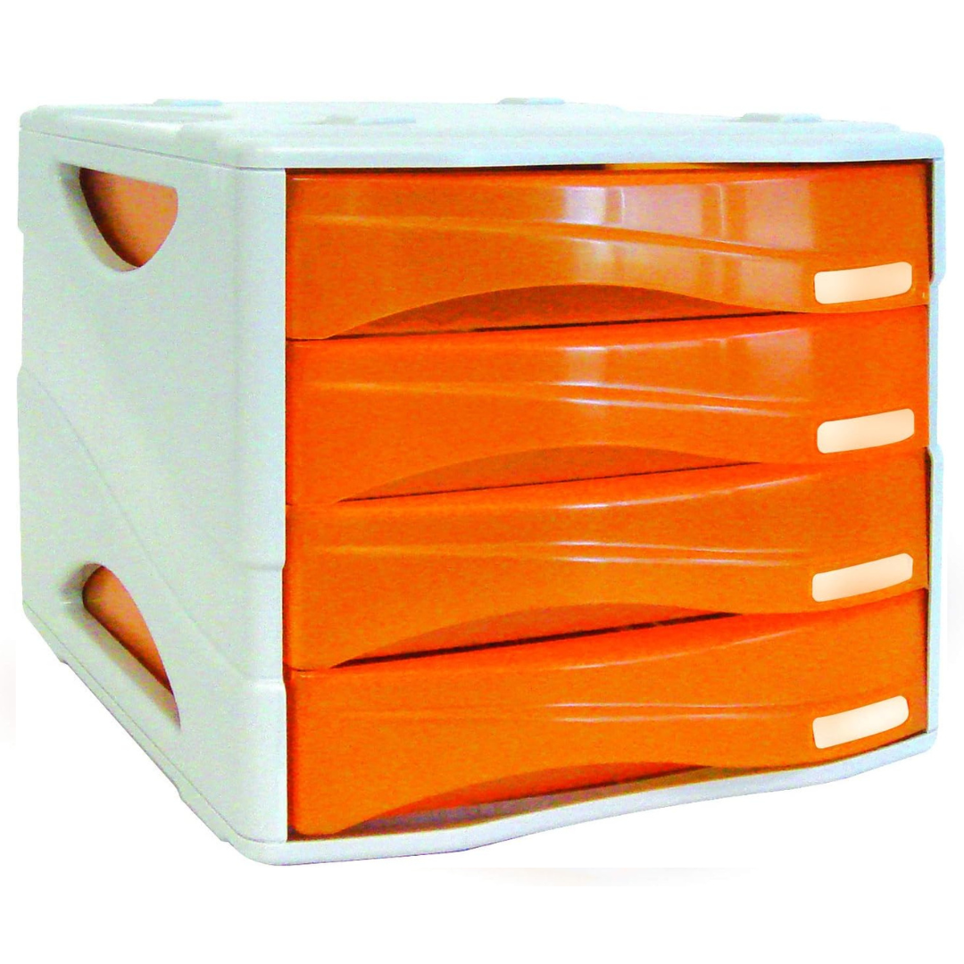 Bloc de rangement 4 tiroirs - 4 Tiroirs en matériel incassable - Coulissement parfait des tiroirs - Trou de préhension pour saisir aisément les documents, étiquettes et portetiquettes fournie - Patins antidérapants et anti-rayures Modulaire et superposition très stable - Proportions idéales pour votre bureau - Dimensions Interne utile 25 x 32 x 5 cm - Couleur : Orange , Bleu