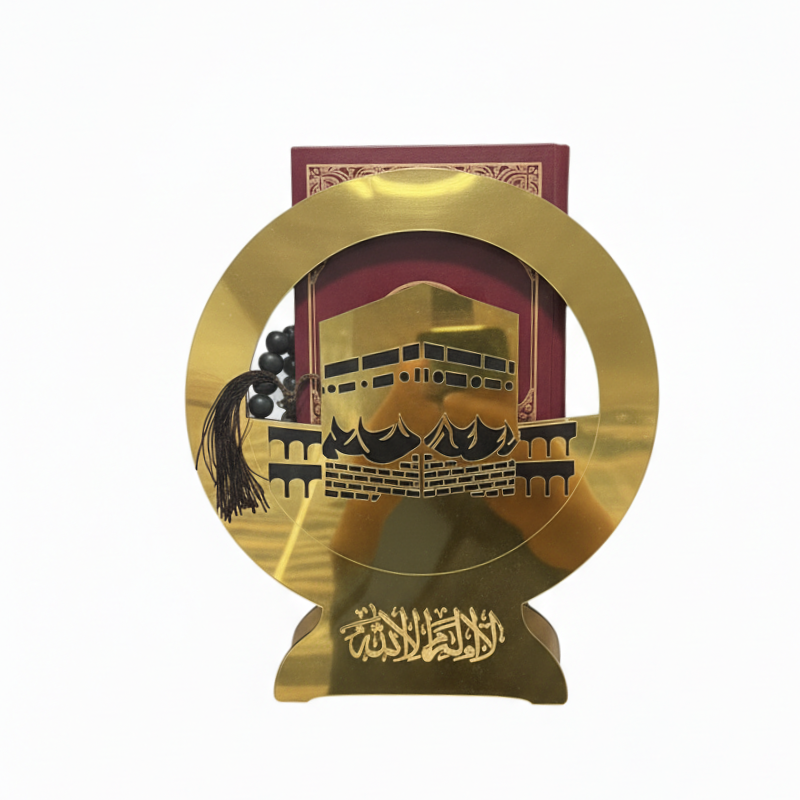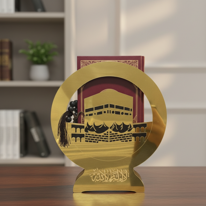 Sa structure circulaire moderne encadre une représentation élégante de la Kaaba, créant une présence spirituelle forte et raffinée dans votre intérieur. Conçu avec une finition dorée brillante et une base stable, ce support maintient le Moshaf en position verticale tout en le protégeant de la poussière et des manipulations fréquentes.