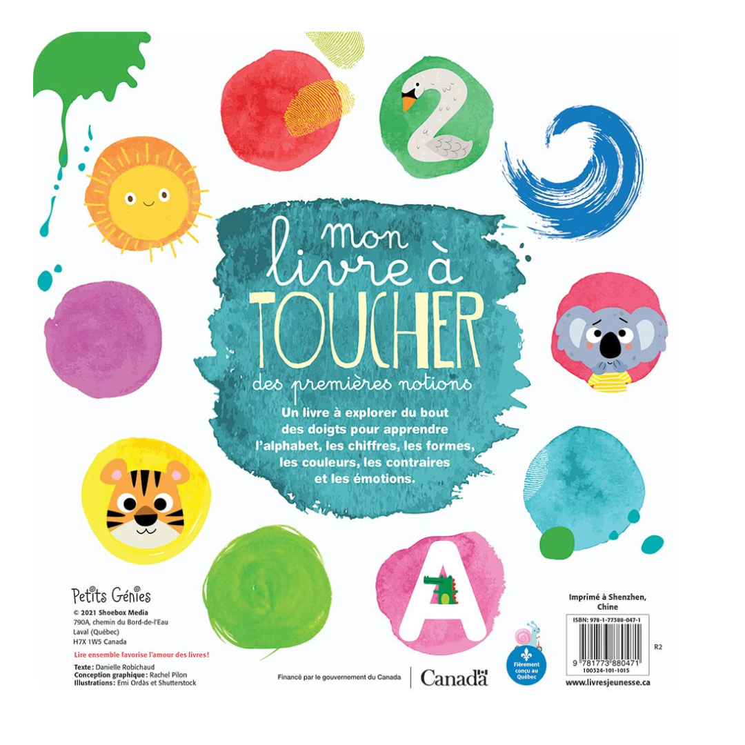 Ce livre tactile se veut une introduction ludique aux notions de base de la préparation scolaire grâce aux thèmes explorés: l’alphabet, les chiffres, les couleurs, les contraires, les formes et les émotions.
