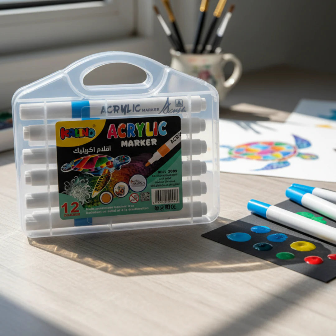 Découvrez les marqueurs acryliques Kalino, conçus pour offrir précision, intensité des couleurs et polyvalence dans tous vos projets artistiques. Grâce à leur encre acrylique hautement pigmentée, ces marqueurs assurent une application fluide, homogène et couvrante dès le premier passage.