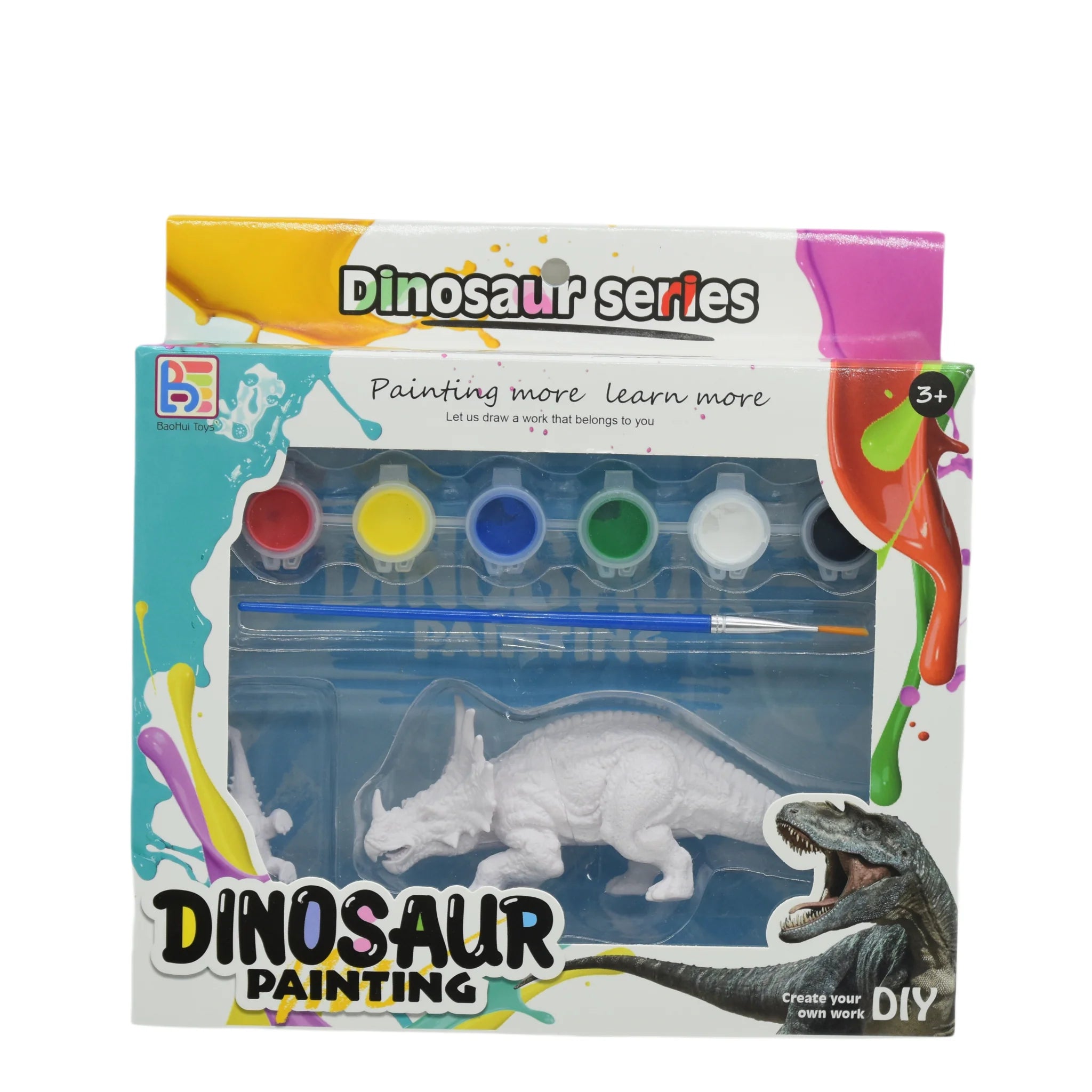 Le kit comprend une figurine de dinosaure blanche prête à être peinte, plusieurs pots de peinture colorée et un pinceau adapté aux petites mains. L’enfant peut choisir ses couleurs, créer son propre design et développer son imagination tout en s’amusant.
