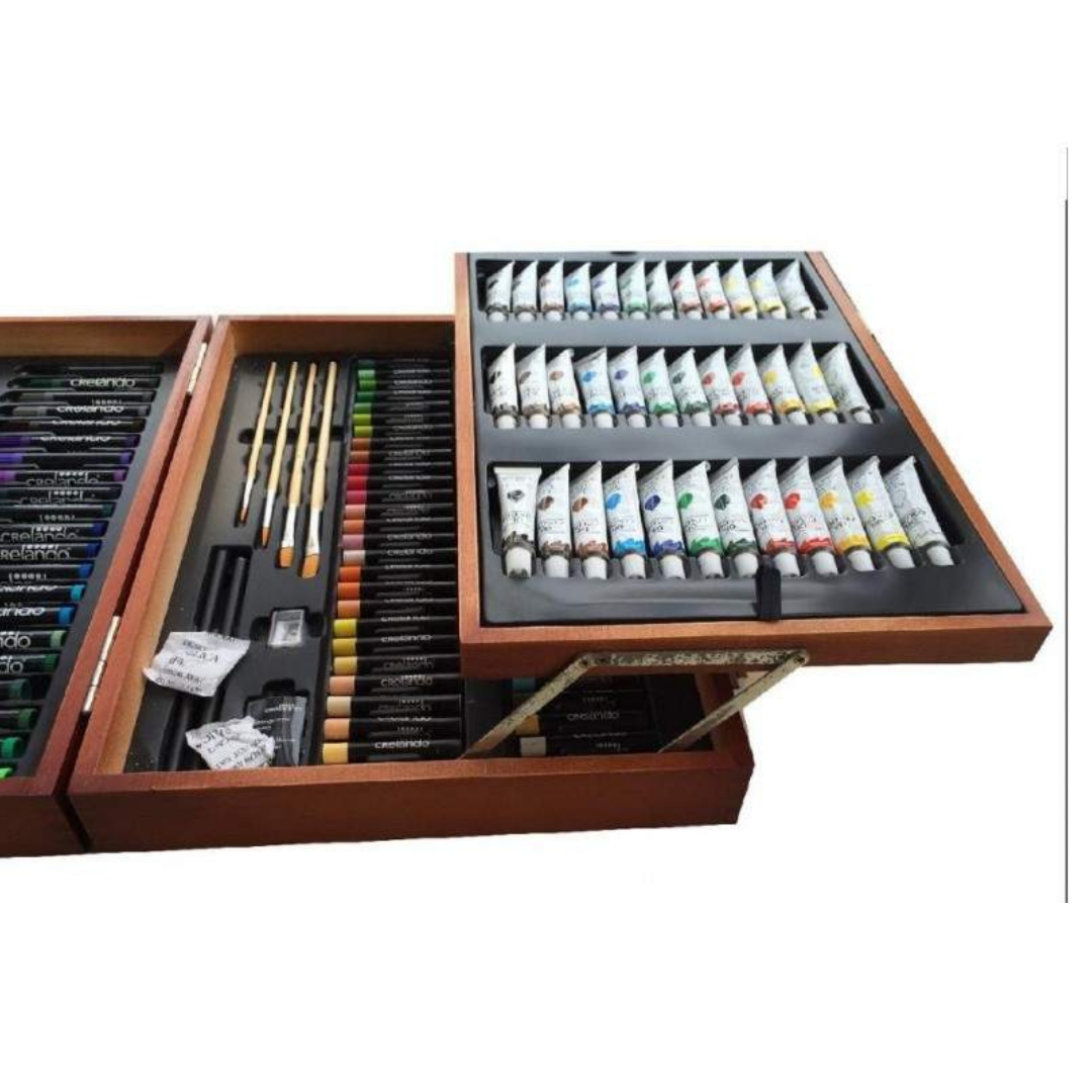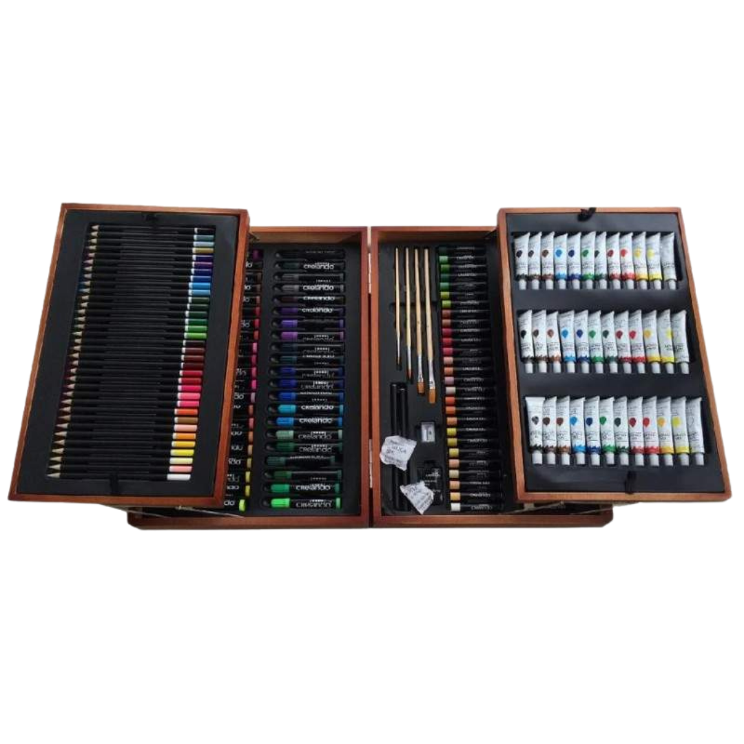 Découvrez la Valise Artiste, un set premium présenté dans une élégante mallette en bois. Conçue pour offrir polyvalence, organisation et confort, elle regroupe l’essentiel du matériel artistique dans un seul kit facile à transporter.