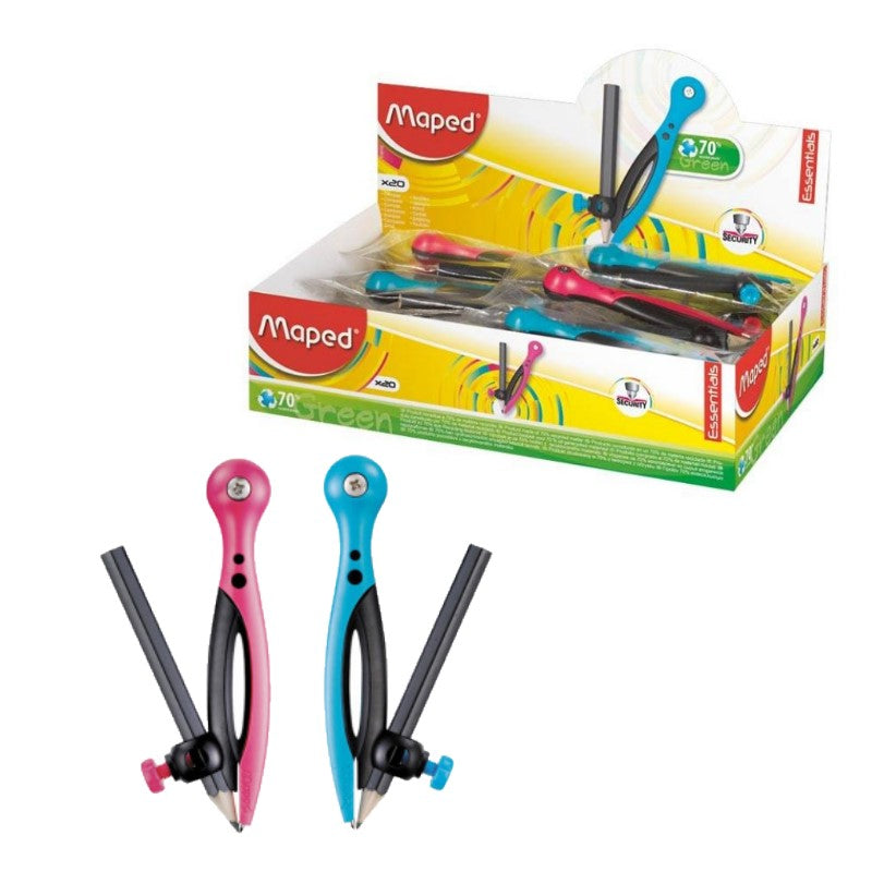 Compas à Bague Plastique Essentials Maped 18111 - Nombre de pièces : 2 pièces (Compas + Crayon) - Hauteur de 12cm pratique pour les enfants - Compas éco-conçu avec 70% de matière recyclée - Convient aux enfants dès 6 ans - Livré avec un crayon de bois - Poids : 40g