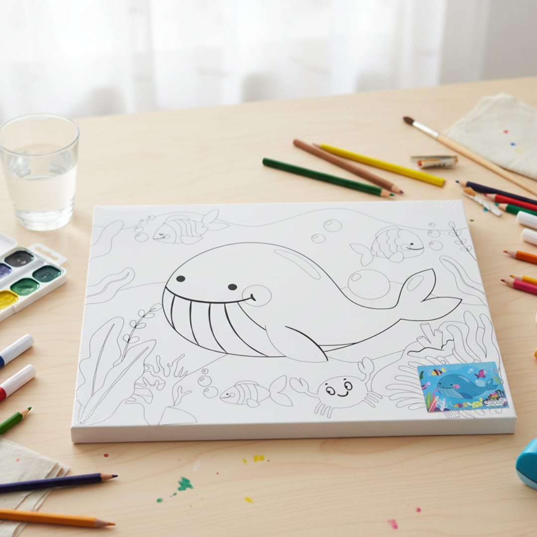 • Format : 40 × 30 cm • Motif : Baleine & animaux marins • Type : Toile imprimée à peindre • Convient dès 3 ans (sous surveillance)