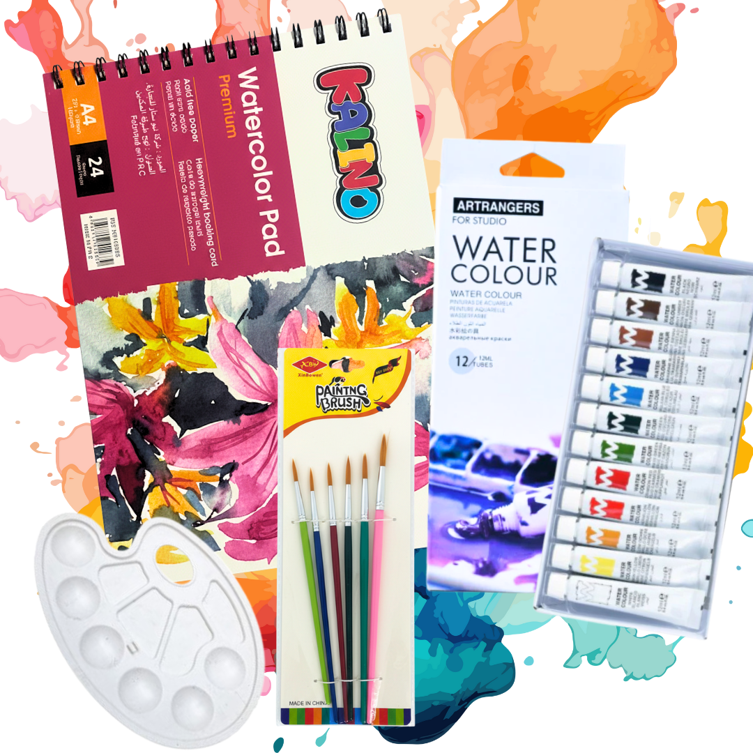 Libérez votre créativité avec ce Kit de Peinture Aquarelle Complet, conçu pour accompagner vos projets artistiques du croquis à la finition. Cet ensemble pratique et équilibré comprend un Bloc Papier A4 Premium 24 Feuilles, un coffret de peintures aquarelle aux couleurs lumineuses, des pinceaux polyvalents et une palette de mélange ergonomique.