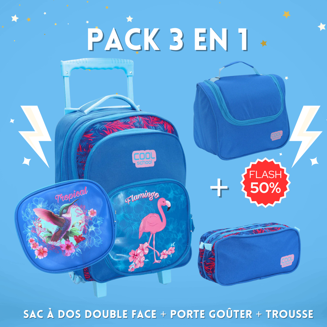 Pack 3 pièces : Sac à dos double face + Porte goûter + Trousse (flamingo)