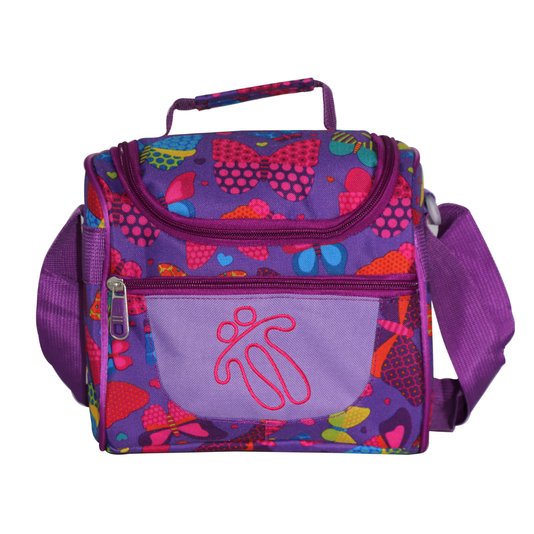 🦋 Design joyeux : motifs papillons, couleurs éclatantes 🧊 Fonction isotherme : garde les repas frais ou chauds 🎒 Confort de portage : bandoulière violette ajustable + poignée rembourrée 🧼 Entretien facile : se nettoie avec un chiffon humide
