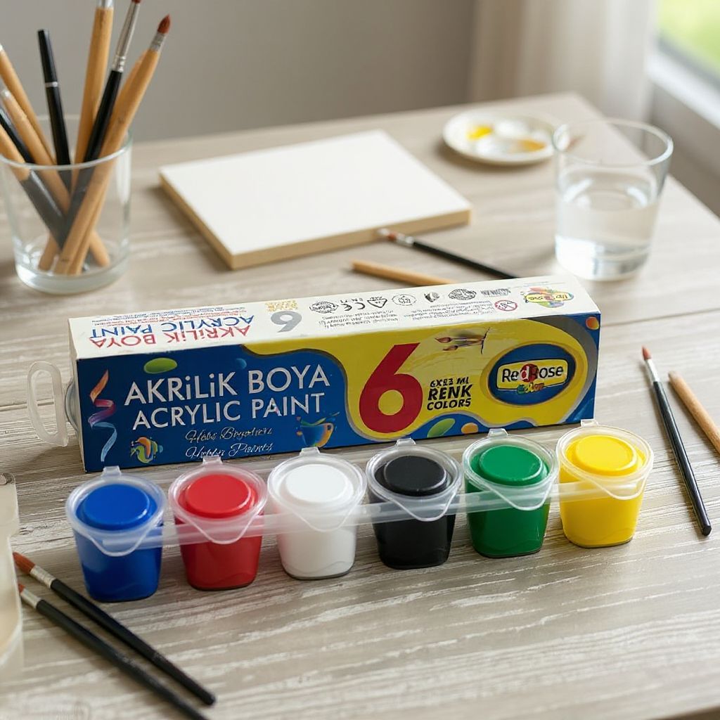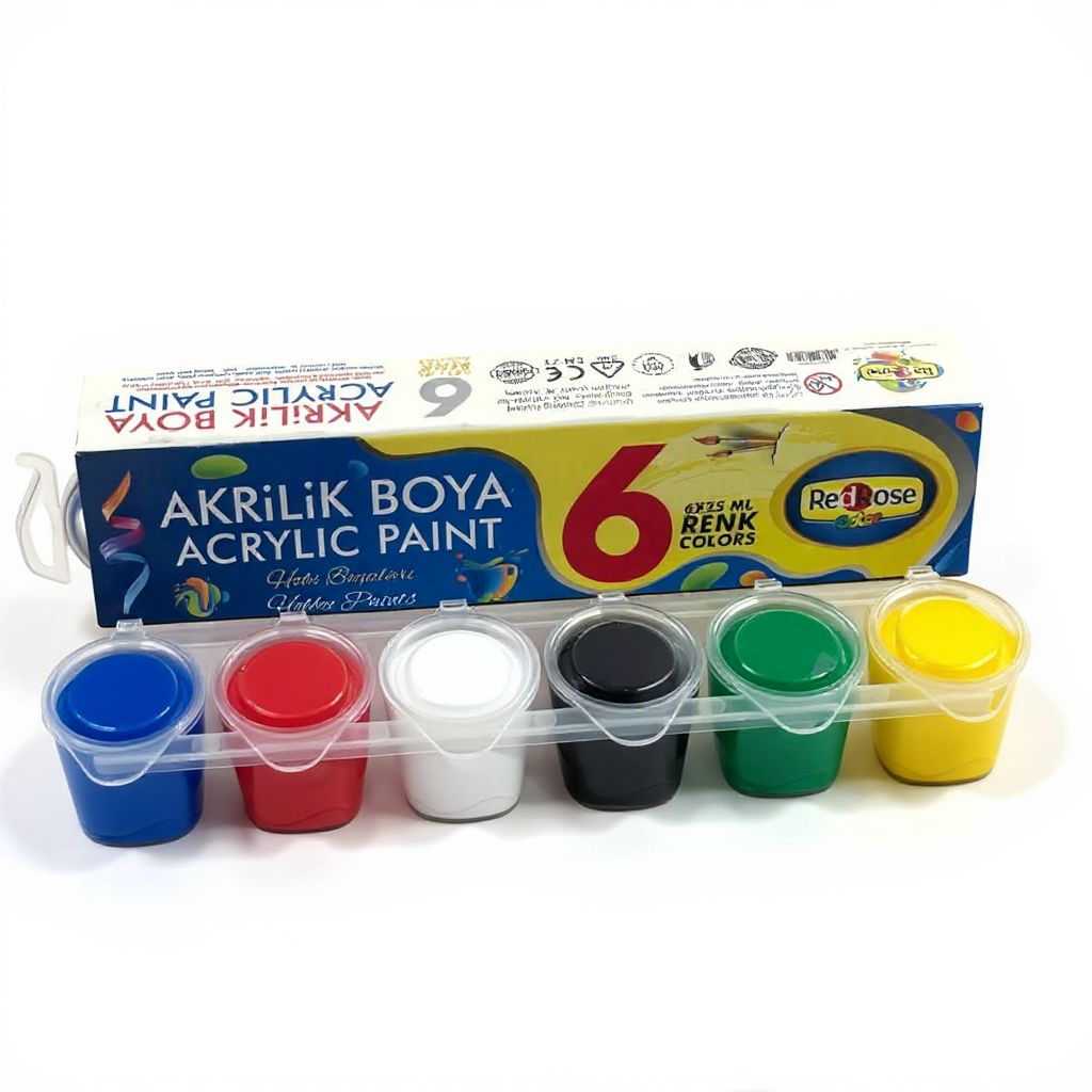 Red Rose Color Set Acrylique 6x25ml - Séchage Rapide | Beaux-Arts : Le set de peinture acrylique Red Rose Color est un kit de démarrage contenant six couleurs fondamentales en pots de 25 ml, conçu pour les artistes amateurs et les projets créatifs en Tunisie. Sa formule à base d'eau offre une pigmentation riche, un séchage rapide et une excellente adhérence sur diverses surfaces comme la toile, le bois ou le papier. Fabriquées en Turquie, ces peintures sont non toxiques et conviennent parfaitement aux enfants comme aux adultes pour les loisirs créatifs. Les couleurs incluses (blanc, noir, jaune, rouge, bleu, vert) sont miscibles entre elles pour créer une palette infinie. C'est le choix idéal pour les projets scolaires, l'artisanat ou pour s'initier à la peinture acrylique avec un matériel de qualité. La consistance fluide assure une application facile au pinceau ou à la spatule.