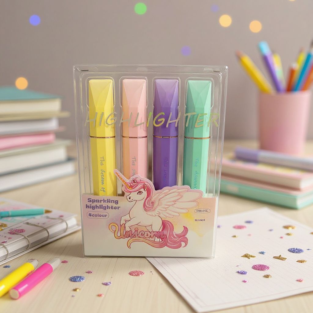 SHU CAL 4 Surligneurs Pailletés Licorne - Pastel | Fournitures : La pochette de 4 surligneurs pailletés Licorne SHU CAL est un set de marqueurs aux couleurs pastel (jaune, rose, violet, vert menthe) conçu pour les scolaires. Chaque surligneur intègre des paillettes fines pour un effet scintillant discret, idéal pour organiser et embellir les notes de cours, journaux ou fiches de révision sans surcharger la page. La pointe biseautée permet un tracé modulable, fin ou large, adapté à la fois au surlignage de texte et au dessin créatif. L'encre à base d'eau assure des couleurs vives et une application fluide sur différents types de papier. Le design thématique licorne sur l'emballage en fait un accessoire de papeterie attractif pour les jeunes. Ce lot est parfait pour ajouter une touche de fantaisie fonctionnelle aux fournitures scolaires.